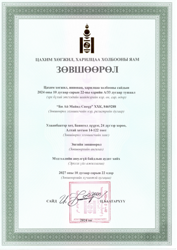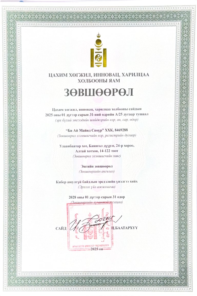 Бид Мэдээллийн аюулгүй байдлын аудит, Кибер аюулгүй байдлын эрсдэлийн үнэлгээ хийх тусгай зөвшөөрөлтэй, төрийн болон хувийн хэвшлийн байгууллагын мэдээллийн аюулгүй байдлын байдал, кибер аюулгүй байдлын эрсдэлд үнэлгээ хийж, стандартын дагуу аудит хийж, дүгнэлт гаргах ЭРХ БҮХИЙ БАЙГУУЛЛАГА юм.